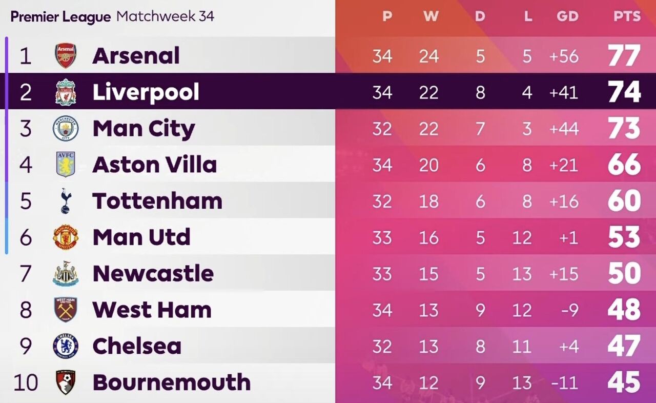 【悲報】プレミアリーグ最新順位表…リバプールさん終戦wwwwwwwww