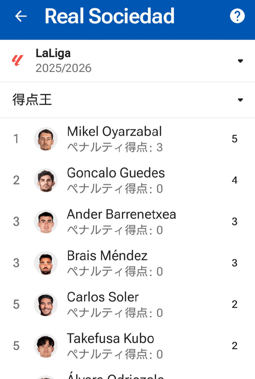 ソシエダチーム内の得点ランキング上位5人