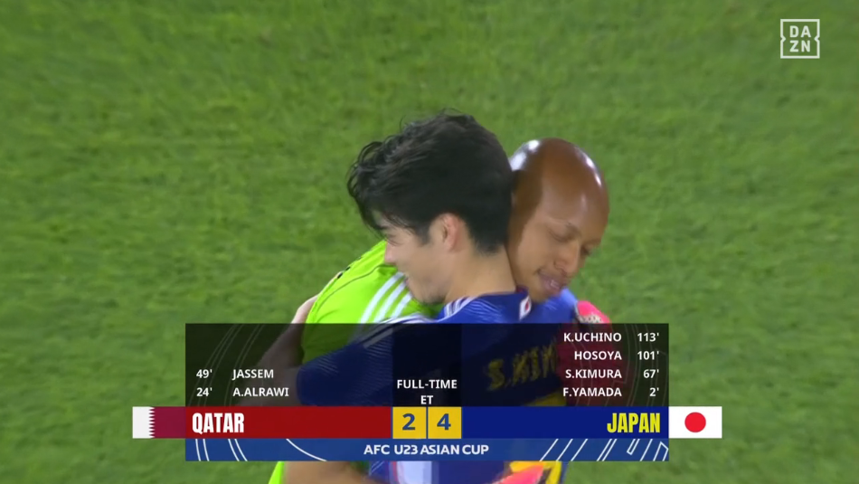 足が止まったカタールに対し、攻め続けたが得点を奪えず延長戦へ。前半にビッグチャンスが訪れた。延長前半11分、細谷が右サイドで途中出場の荒木のスルーパスに反応。ゴールキーパーの股を抜く、今大会初ゴールでついに勝ち越し点を奪った。さらに前がかりになったカタールに対し、後半7分、追加点を奪って逃げ切った。