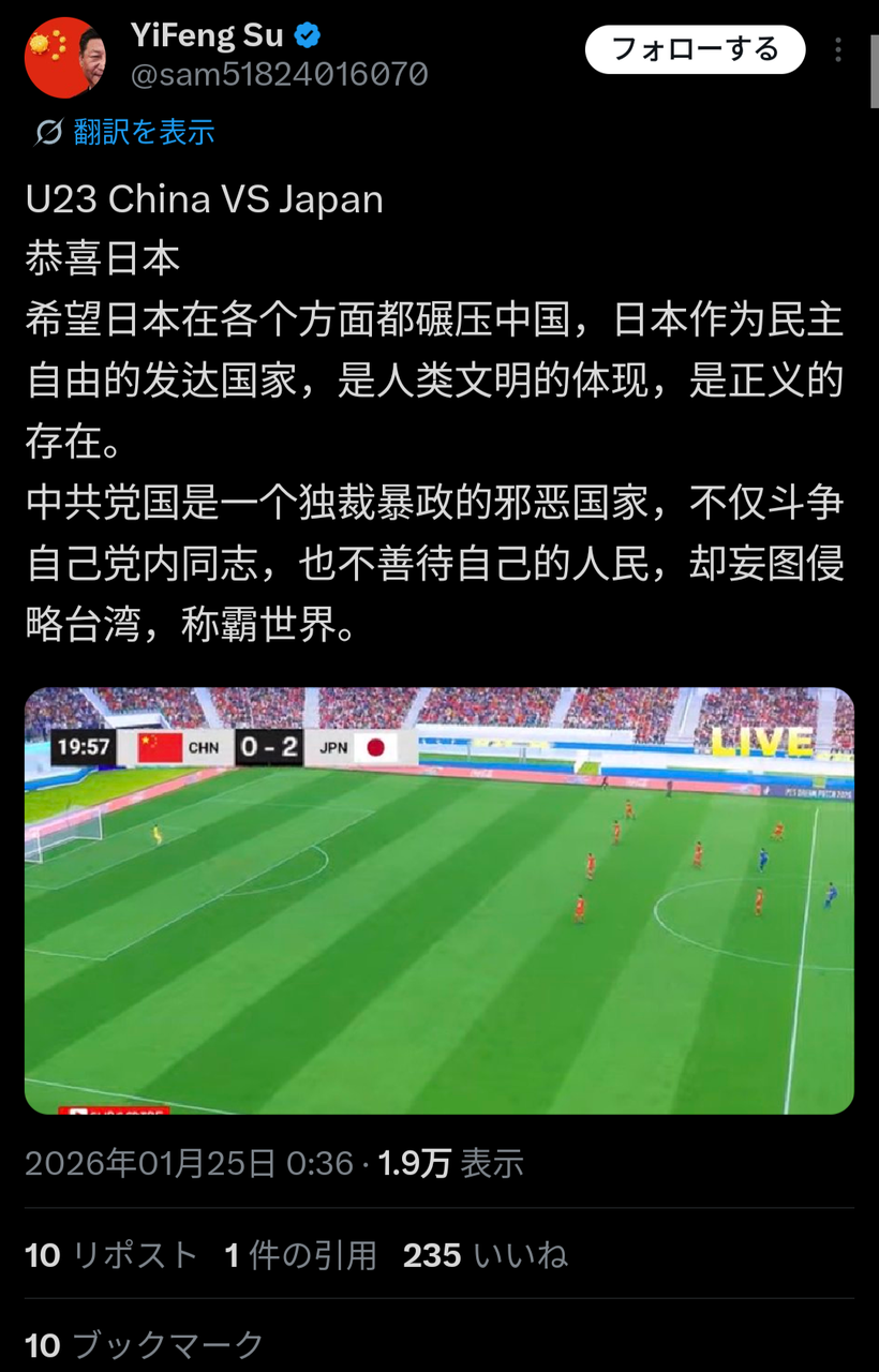 【悲報】中国人サッカーファン、とんでもないコメントをしてしまう😨大丈夫かこれ…