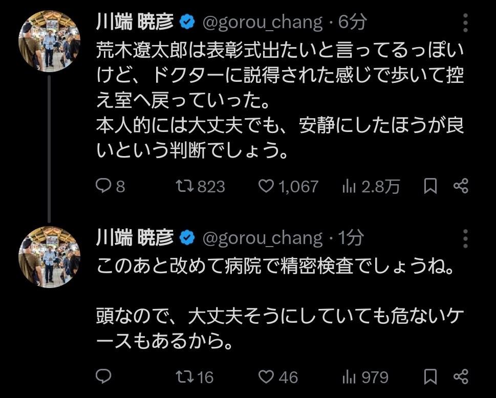 【速報】相手GKと激突で負傷交代した荒木遼太郎さん、とりあえず大丈夫な模様…! スポンサーリンク サッカー 2024/05/04 07:49 【速報】相手GKと激突で負傷交代した荒木遼太郎さん、とりあえず大丈夫な模様…! 767: 名無し@サカサカ10 2024/05/04(土) 02:50:52.42 荒木とりあえず大丈夫っぽい 続きを読む