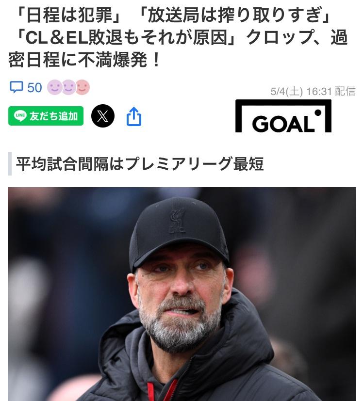 【悲報】リバプールのクロップ監督『日程は犯罪的』『TV局は搾り取りすぎ』『なのでCLもELも負ける』 スポンサーリンク サッカー 2024/05/06 23:19 【悲報】リバプールのクロップ監督『日程は犯罪的』『TV局は搾り取りすぎ』『なのでCLもELも負ける』 415: 名無し@サカサカ10 2024/05/06(月) 01:28:45.03 日程は犯罪🤓 続きを読む