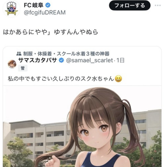 Jリーグ FC岐阜がXで誤爆し謝罪、試合中にスク水女児のイラストを投稿