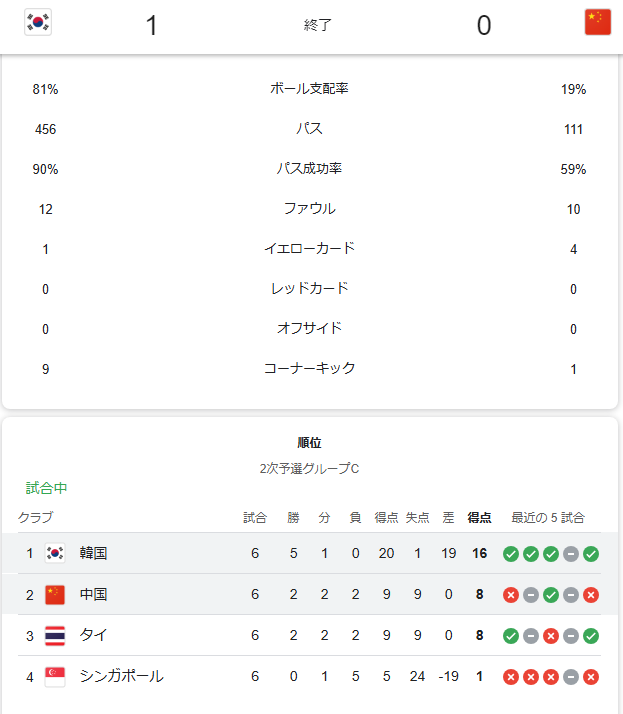 勝ち点5、得失点差-2のタイ代表は、先に行われた中国対韓国の結果(0-1)により、シンガポール戦で3点差以上の勝利が必要となったなか、序盤から主導権を握る展開が続くと前半37分、裏に抜け出したMFチャナティップの折り返しをFWスファナット・ムエアンタが押し込み先制に成功する。さらに猛攻を仕掛けるも、追加点は奪えずに1-0で折り返した。