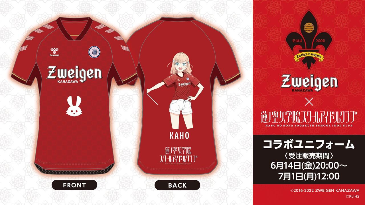6月23日のJ3リーグ第18節・ギラヴァンツ北九州戦をコラボマッチとして開催し、試合当日はキャストの楡井希実(日野下花帆役)、櫻井陽菜(百生吟子役)が 新スタジアムである金沢ゴーゴーカレースタジアムに登場し、イラストを使用したグッズも展開される。そのコラボマッチの1週間前に、特製のコラボユニフォームが発表されたのだ。