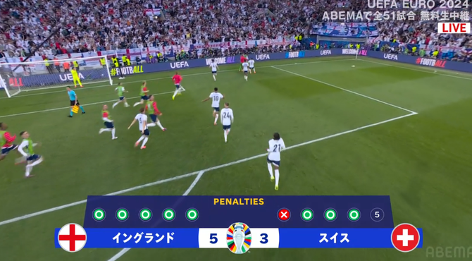 120分間で決着がつかず、PK戦では1人が失敗したスイスに対し、イングランドは5人全員が成功。5-3で制し、2大会連続の4強入りを果たした。