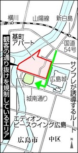 8月で開業から半年となったエディオンピースウイング広島(広島市中区)。J1サンフレッチェ広島主催の試合がある日は、トラブルを避けるため、観戦に来た人が市営基町アパートのエリアを通り抜けないよう、交通規制が敷かれている。