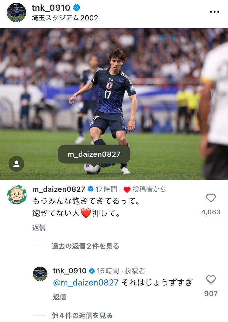 【朗報】前田大然さん、田中碧さんのインスタで画期的ないいね数の増やし方をしてしまうwwwwwww スポンサーリンク サッカー 2024/09/08 07:59 【朗報】前田大然さん、田中碧さんのインスタで画期的ないいね数の増やし方をしてしまうwwwwwww 1: 名無し@サカサカ10 2024/09/07(土) 23:22:25.714 田中碧がボールを前田のスキンヘッドに見立ててメンションを付けるといういつものお約束のやり取りをする ↓ 前田「飽きてない人❤押して」 ↓ ❤が増える 続きを読む