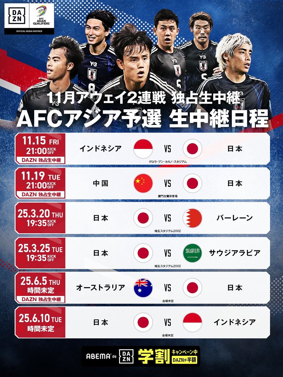 11月15日に行われたアウェイのインドネシア代表戦で日本代表は、4-0で勝利を収めた。勝ち点を「13」に伸ばしたこの一戦は、DAZNが独占生中継を実施。また、この試合は有料プラン『DAZN Standard』加入者を対象とした従来のライブ配信に加えて、豪華ゲストの出演等で日本代表の熱戦を楽しめる『FanZone』配信が無料開放された。DAZNによれば、今回のインドネシア代表戦が、史上最多視聴者数を記録したという。なお、これまでの最多は、2022年3月24日に独占配信された前回のアジア最終予選のオーストラリア代表対日本代表だった模様。また、19日に行われる第6戦アウェイの中国代表戦でも、『FanZone』が登録なしの無料で配信することも合わせて発表している。