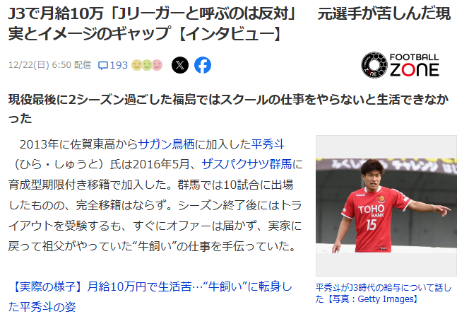 現在、JリーグはJ1からJ3まで各20クラブが参戦し、全60クラブで構成されている。だが、そこでプレーする選手の年俸には、大きなバラつきがある。年俸120万円にも満たない額でプレーしていた平氏は「しんどかったですよ。でも、そのことを周りの人は知らないし『Jリーガー』として扱われるんです。その現実と周囲とのイメージのギャップもキツかったですね。当時より今は選手の待遇も改善されたかもしれませんが、僕は個人的にJ3の選手たちまでも『Jリーガー』と呼ぶのは反対なんです」と語る。