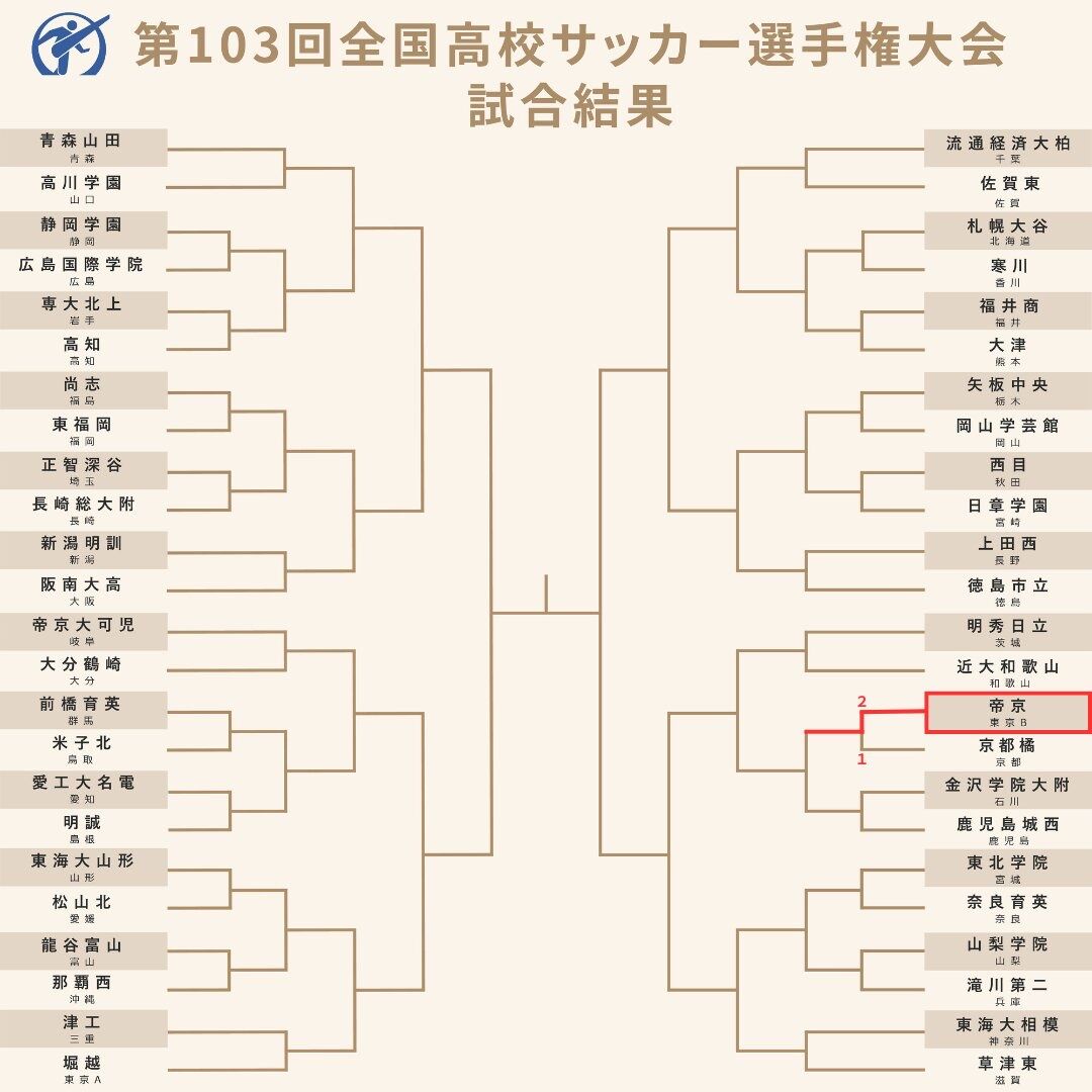 後半は京都橘が序盤から何度もゴール付近までチャンスを作ると、後半33分にショートコーナーからのクロスにMF桐原惺琉(3年)がヘディングで合わせて同点に。追いつかれた帝京だったが、中盤付近でボールを奪うと後半35分にFW宮本周征(2年)がゴール右隅にうまくコントロールしたシュートを決めてすぐさま勝ち越した。