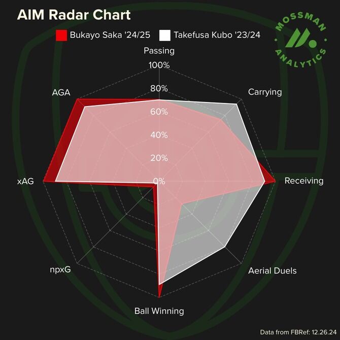 【驚愕】久保建英とブカヨ・サカのスタッツレーダーチャートの形がそっくりな件www