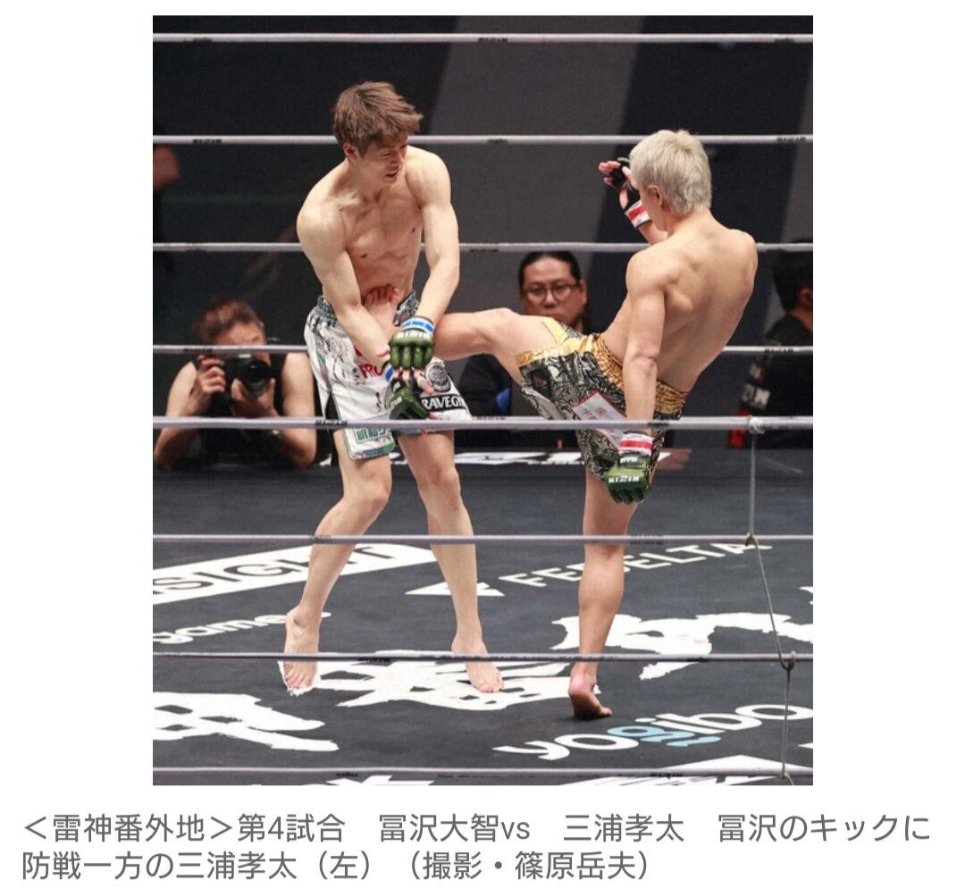 第1部「雷神番外地」の第4試合で“キングカズ”ことサッカー元日本代表FW三浦知良の次男で格闘家の三浦孝太(BRAVE)がブレイキングダウンの実力者・冨澤大智(フリー)に1RKO負け。プロ3連敗を喫した。