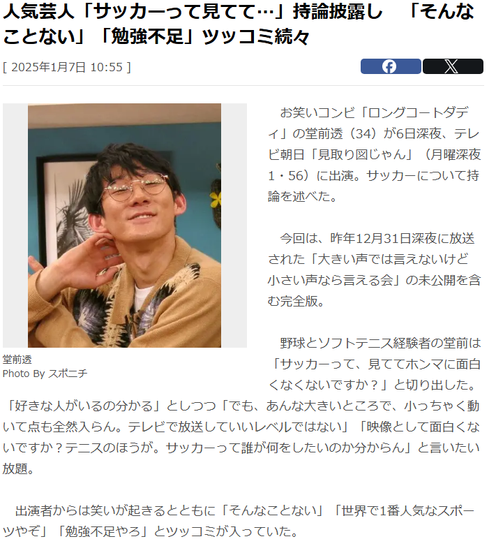 【悲報】サッカー面白くないと発言の芸人さん(堂前透)、ただの野球ファンだったwwwwwwww スポンサーリンク サッカー 2025/01/08 01:39 【悲報】サッカー面白くないと発言の芸人さん(堂前透)、ただの野球ファンだったwwwwwwww 13: 名無し@サカサカ10 2025/01/07(火) 18:52:27.50 「ロングコートダディ」の堂前透 ↑ こいつは野球ファン(ヤクルトファン) 野球ファンってリアルでもサッカー叩きしてくる人多いよ サッカーファンはそんなことしないのに本当に野球ファンは差別主義者しかいない 続きを読む