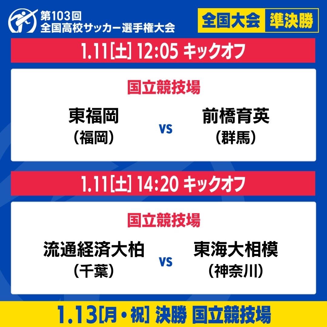 12時5分キックオフの第1試合では東福岡(福岡)と前橋育英(群馬)が決勝進出をかけて激突する。続く14時20分試合開始予定の第2試合では流通経済大柏(千葉)と東海大相模(神奈川)が対戦する。