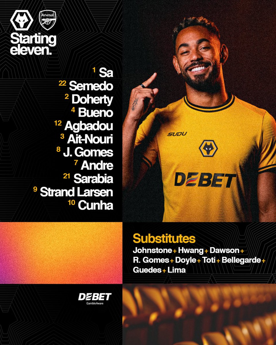 Jose Sa; Semedo(C), Doherty, Bueno, Agbadou, Ait-Nouri; Joao Gomes, Andre, Sarabia, Matheus Cunha; Strand Larsen.