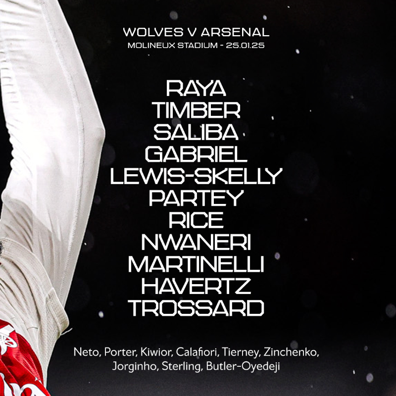 Raya; Timber, Saliba, Gabriel(C), Lewis-Skelly; Thomas, Rice, Nwaneri; Martinelli, Havertz, Trossard.