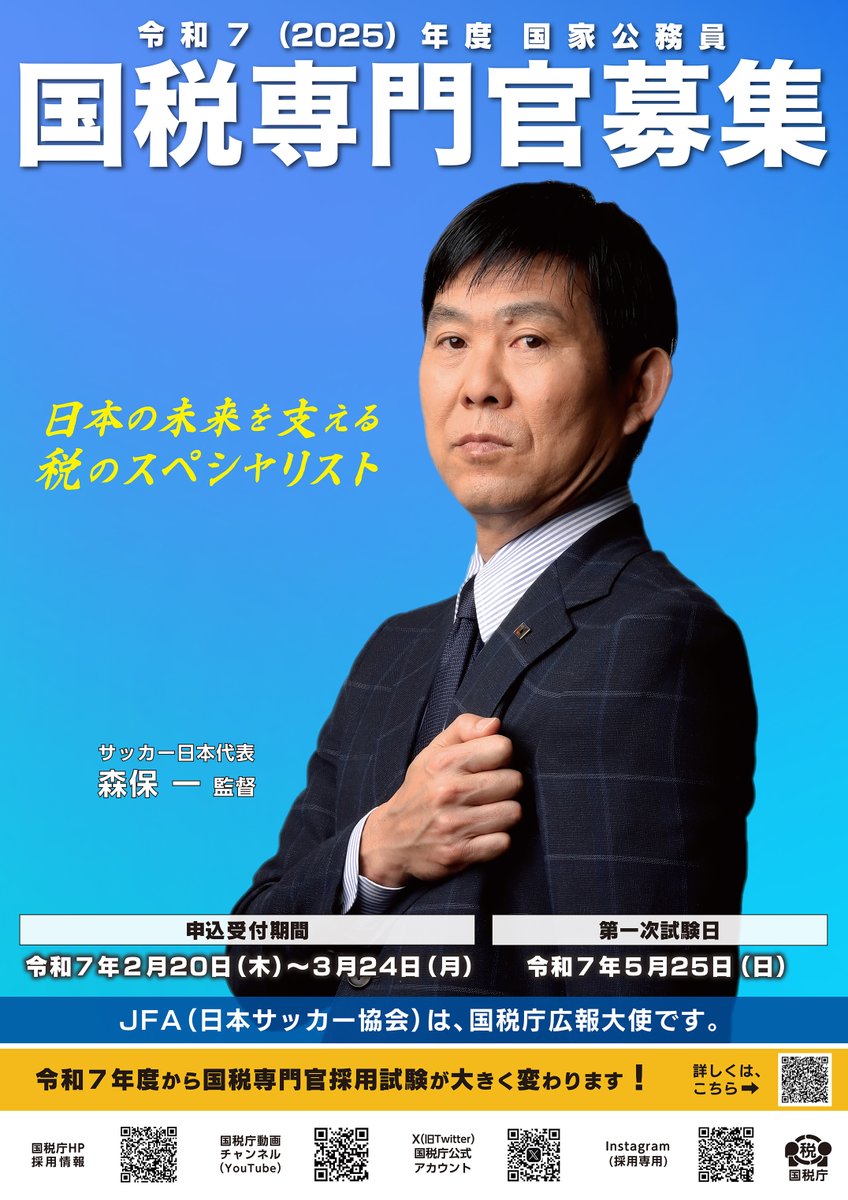https://news.yahoo.co.jp/articles/f7840ee3537da5c040708a09a55d7c280f33ccea国税庁は2025年度の国税専門官募集ポスターに、サッカー日本代表の森保一監督を起用した。
