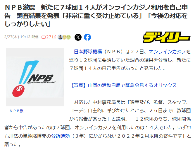 NPB激震 7球団14人がオンラインカジノ利用を自己申告 調査結果を発表「いずれも単純賭博罪の公訴時効にかからな案件」