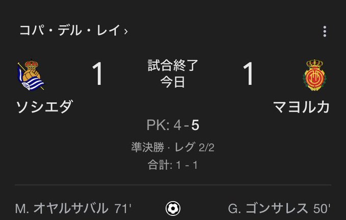 【速報】久保出場のソシエダ、PK戦でマジョルカに負けて国王杯準決勝敗退…