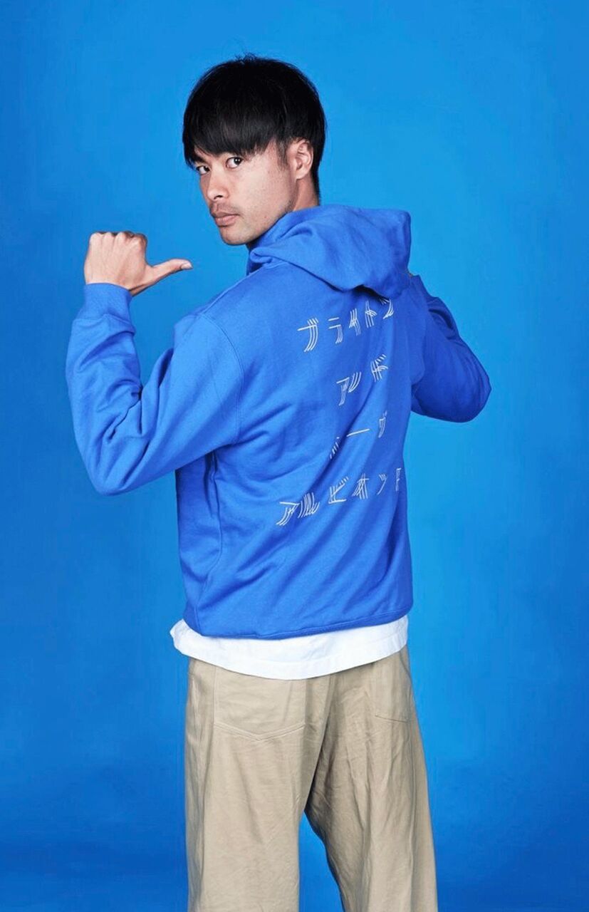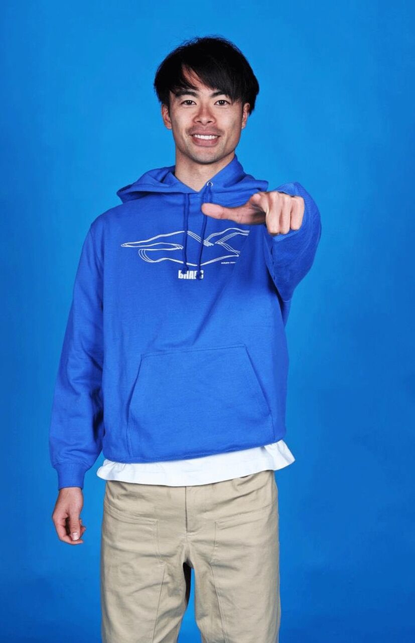 問題の青色のパーカーは、前面にクラブのモチーフになっているカモメのデザインが入っているのだが、目をひくのが背中のプリント。