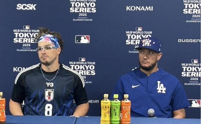 【画像】ドジャースのキケ、開幕前会見に何故かサッカー日本代表ユニ姿で登場wwwwww
