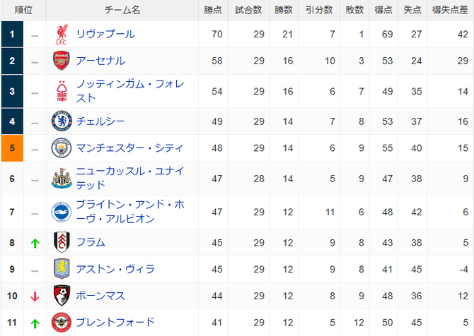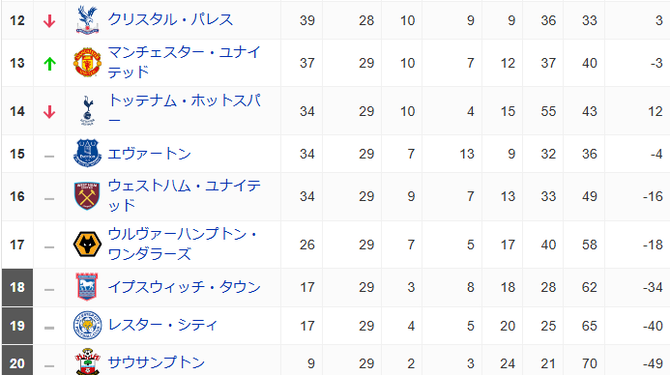【悲報】プレミアリーグ、ビッグ6が予想外の順位にwwwwww