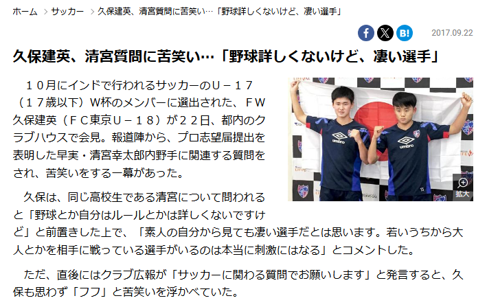 【悲報】久保建英さん、昔から野球記者に目をつけられてた模様wwwww