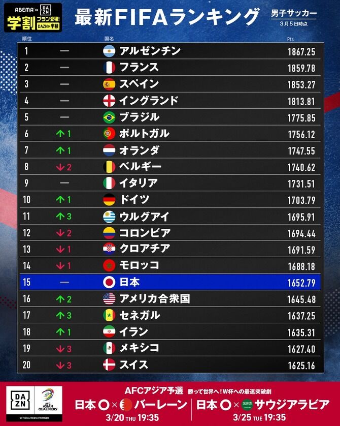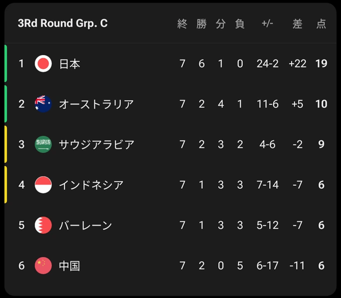 この結果、サウジアラビアは勝点を9に伸ばし3位に浮上。2位のオーストラリアと1ポイント差だ。一方の中国は勝点6で最下位のまま。25日にサウジアラビアは、すでにW杯出場を決めている日本とアウェーで対戦し、中国はホームでオーストラリアと激突する。