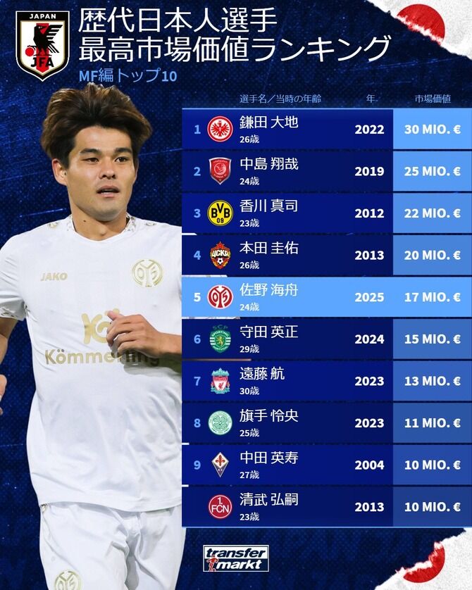 【悲報】佐野海舟さん、日本人ボランチで市場価値が1番高い選手になってしまうwwwwww