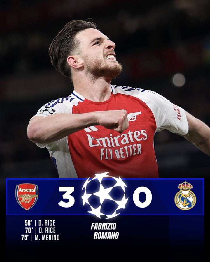 ライスが圧巻の直接FK2発! アーセナルが王者マドリーに3-0先勝でベスト4進出に王手【CL】