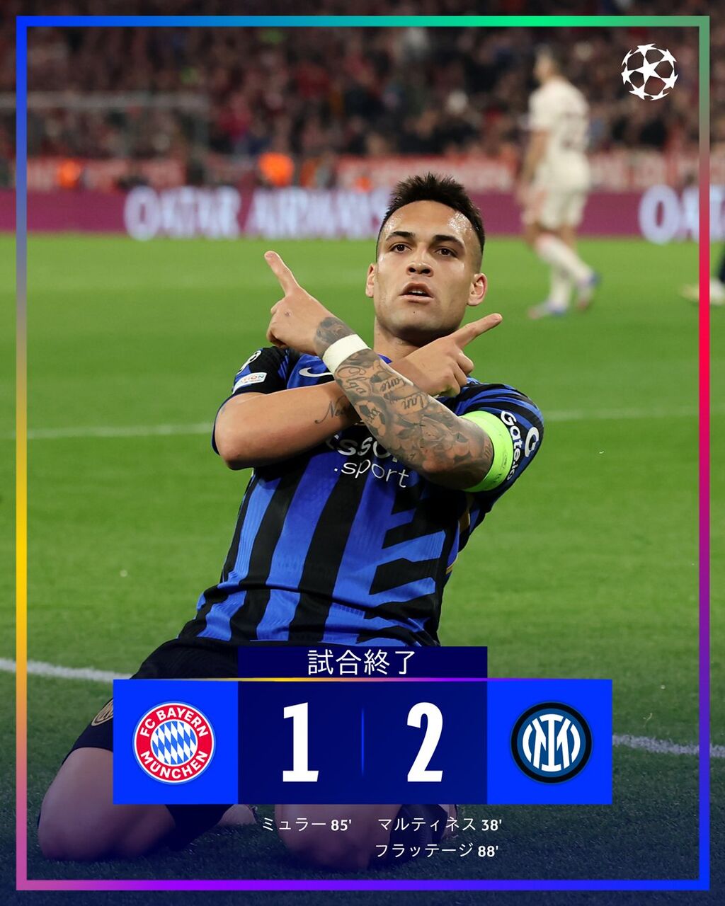 ラウタロ&フラッテージ弾のインテルが敵地で大きな先勝、バイエルンは途中出場ミュラーが一時同点弾も惜敗【CL】