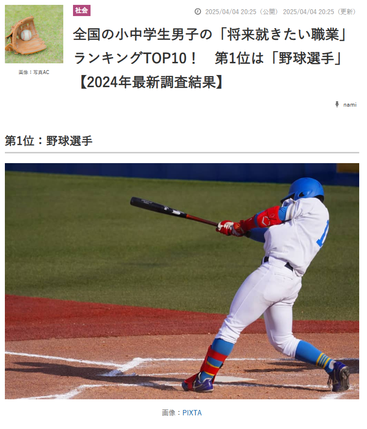 第1位は「野球選手」でした。同調査では、小学生男子部門で第1位、中学生男子部門では第2位で、高い人気を集めている職業です。