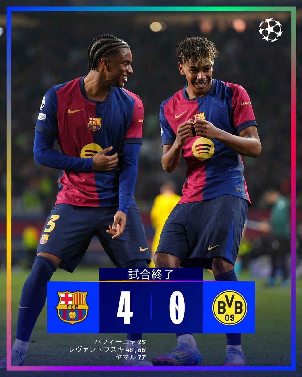 バルセロナが昨季準優勝のドルトムントに4-0圧勝! ラフィーニャの先制ゴール、レバンドフスキの2発、ヤマルのダメ押し弾で第1レグを制す 【CL準々決勝】