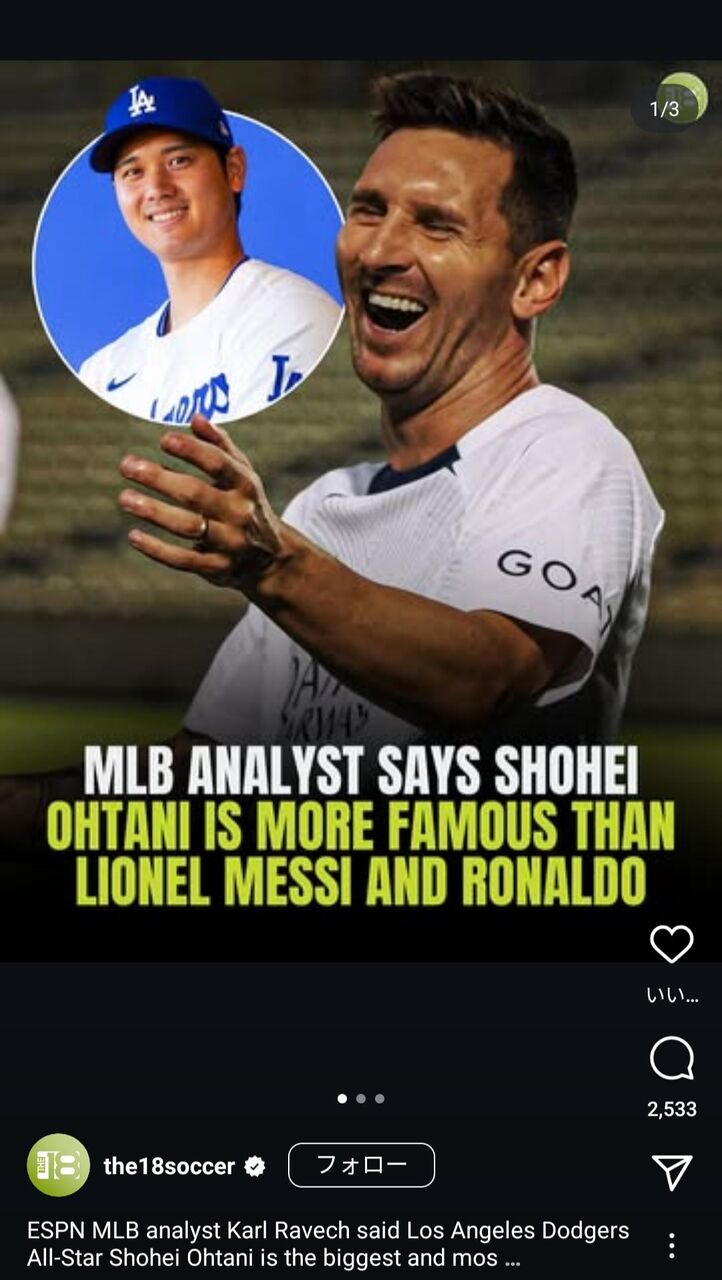 【速報】アメリカ人「大谷はメッシ、クリロナよりも人気があり有名だ!!」←世界的大炎上wwwww