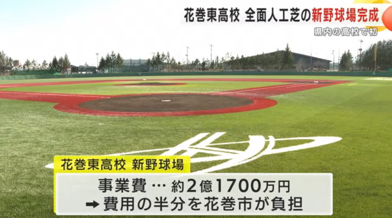 花巻東高校 全面人工芝の新野球場が完成 岩手県内の高校で初 事業費約2億1700万円、費用の半分を花巻市が負担