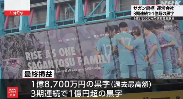 サッカーJ2、サガン鳥栖を運営するサガン・ドリームスの昨シーズンの決算は、3期連続で1億円を超える黒字となり、1億5800万円余りあった債務超過を解消したということです。