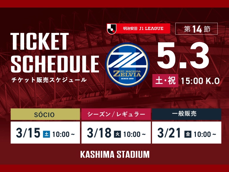 鹿島アントラーズは来る5月3日にカシマサッカースタジアムでFC町田ゼルビアと対戦する。