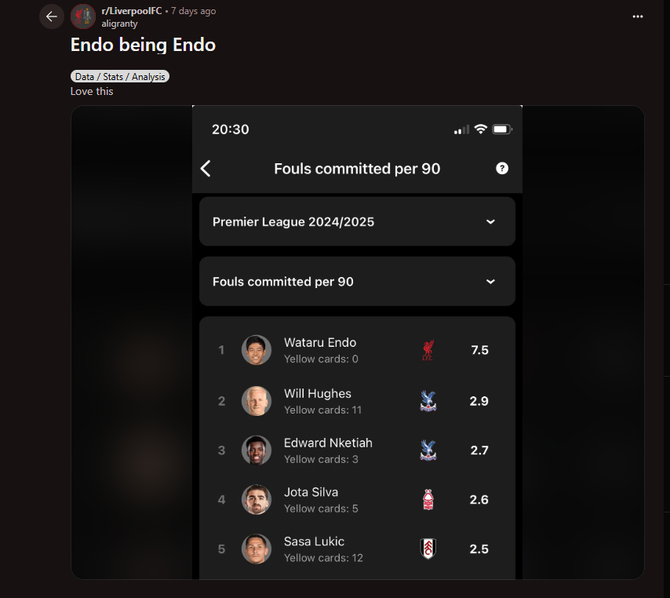【朗報】リヴァプール遠藤航さん、90分あたりのファール数が2位の3倍7.5でイエローカード0枚というクリーンな狂戦士っぷりを見せつけるwwwwww