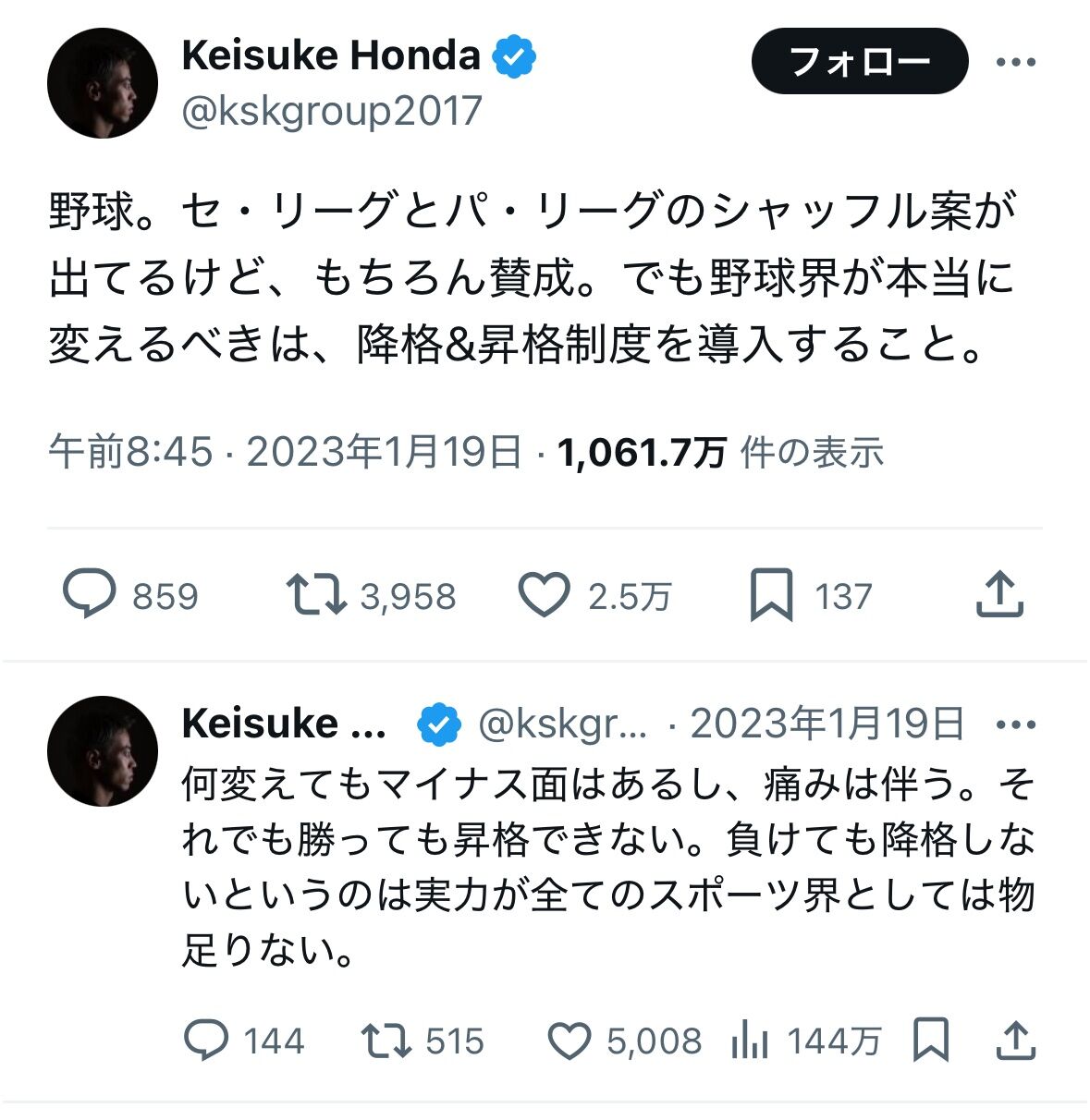 【正論】本田圭佑さん「野球が盛り上がりに欠けるのは昇降格制度がないから。」→いいね2.5万賛同の嵐wwwwwwwww