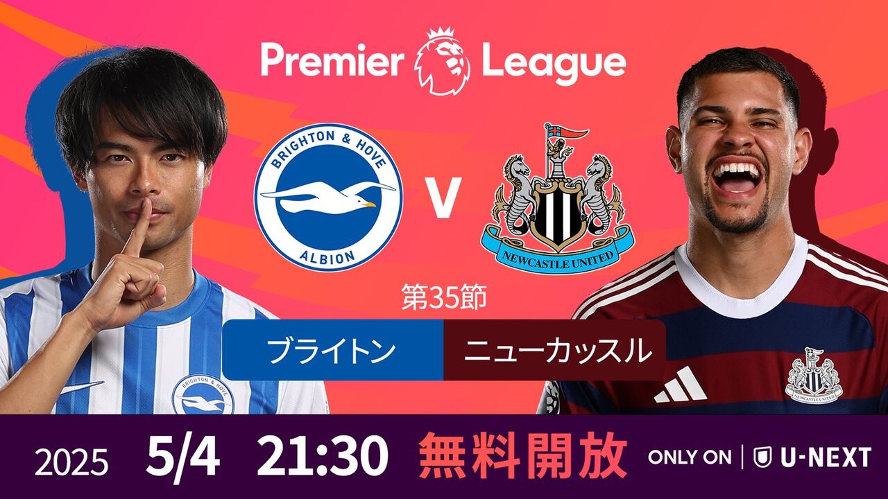 今シーズンからプレミアリーグを独占配信している「U-NEXT」にて、日本時間5月4日(日)に開催されるブライトンとニューカッスルの一戦が無料ライブ配信されることに。キックオフは22時の予定となっており、配信は21時30分から開始される。パソコンやテレビの他、アプリをダウンロードした場合にはスマートフォンやタブレットでの視聴も可能だ。