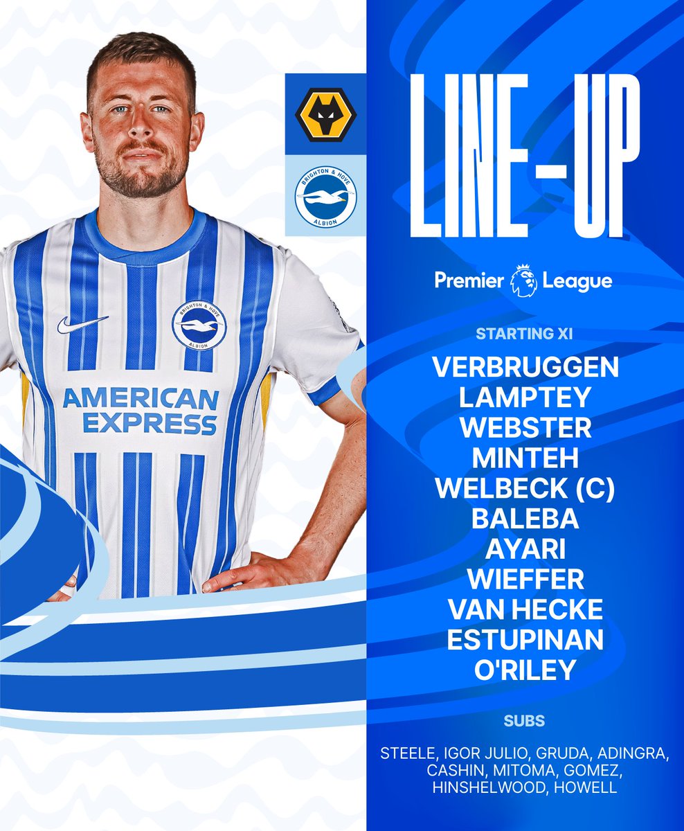 Verbruggen; Lamptey, Webster, van Hecke, Estupinan; Baleba, Wieffer, O’Riley, Minteh, Ayari; Welbeck(C).
