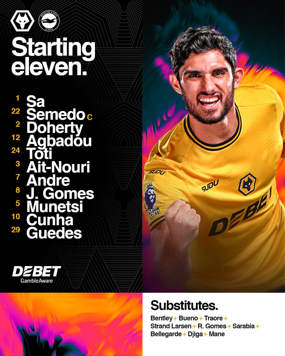 Jose Sa; Semedo(C), Doherty, Agbadou, Toti, Ait-Nouri; Andre, Joao Gomes, Munetsi; Matheus Cunha, Guedes.