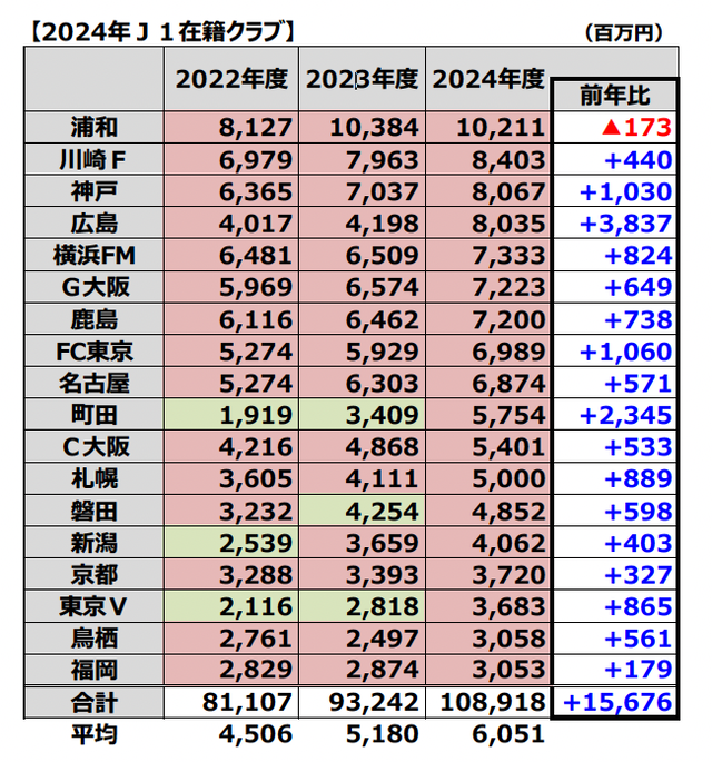 クラブ別のトップは、2年連続で売上高100億円を突破した浦和(102億円)。川崎が84億円で続き、神戸と広島はともに80億円を記録した。広島は24年に開場した新スタジアム効果により、前期比38億円増となった。