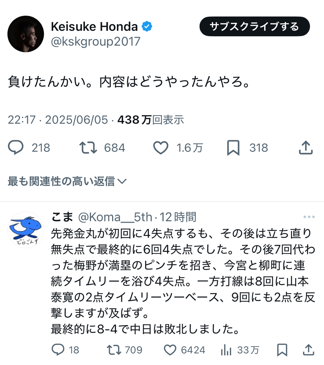 【爆笑】本田圭佑「(日本代表)負けたんかい。内容はどうやったんや」中日ファン「!!(シュババババ)」wwwwww