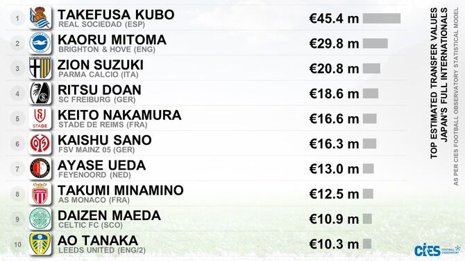 スイスのサッカー専門調査機関『CIES Football Observatory(CIES)』は、日本人選手の推定移籍金ランキングを発表した。