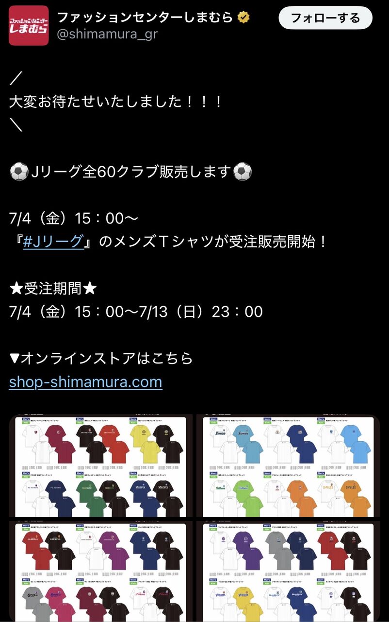 【速報】ファッションセンターしまむら、Jリーグ全60クラブのTシャツを発売wwwwwwww スポンサーリンク サッカー 2025/07/02 16:29 【速報】ファッションセンターしまむら、Jリーグ全60クラブのTシャツを発売wwwwwwww 1: 名無し@サカサカ10 2025/07/01(火) 03:39:41.20 J3まで含めてるの凄いな 続きを読む