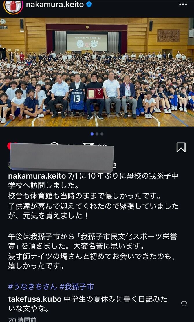 中村敬斗のインスタの投稿に対し辛辣なコメント