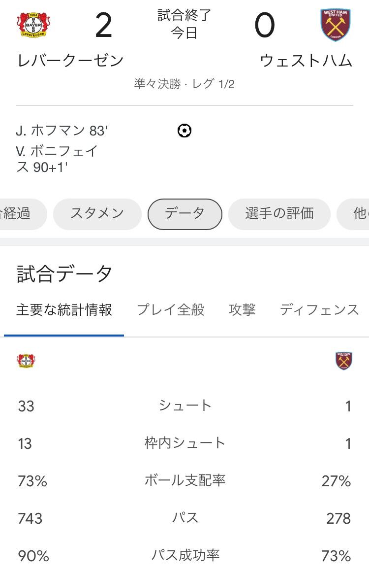 レヴァークーゼンvs.ウェストハムのスタッツに驚愕・・・下部リーグ相手でもここまでなるか?