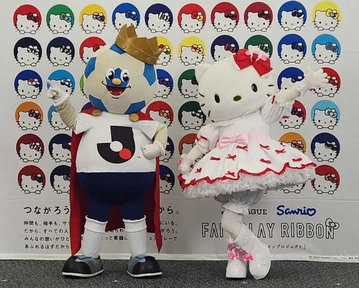 会見にはハローキティがJリーグキングとともに登場。「Jリーグとのフェアプレーリボンプロジェクト、とっても楽しみにしていま~す」と強調した。